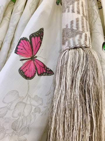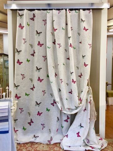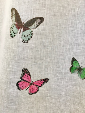 "In" vetrina, anticipazioni di primavera, garza di lino per tendaggi, con coordinato in tela strutturata sempre in puro lino, si presentano con raffinate farfalle stampate. Tessuti provenienti dalla prestigiosa casa Inglese Sanderson.